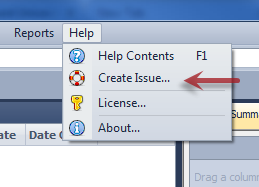 If a bug or issue is encountered while running the client application, there is a simple dialog box that you can use to create an issue. From the Help menu, select Create Issue.