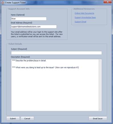 The following dialog window will appear. This will automatically create a support ticket at our support portal http://support.streamsidesolutions.com.