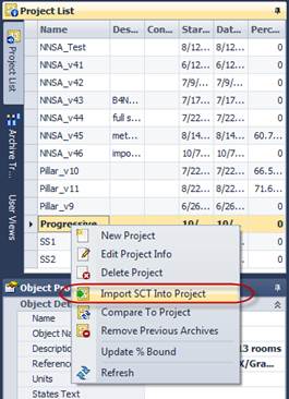 From the SCT or Project menu, select Import SCT Database or right-click to get the context menu.